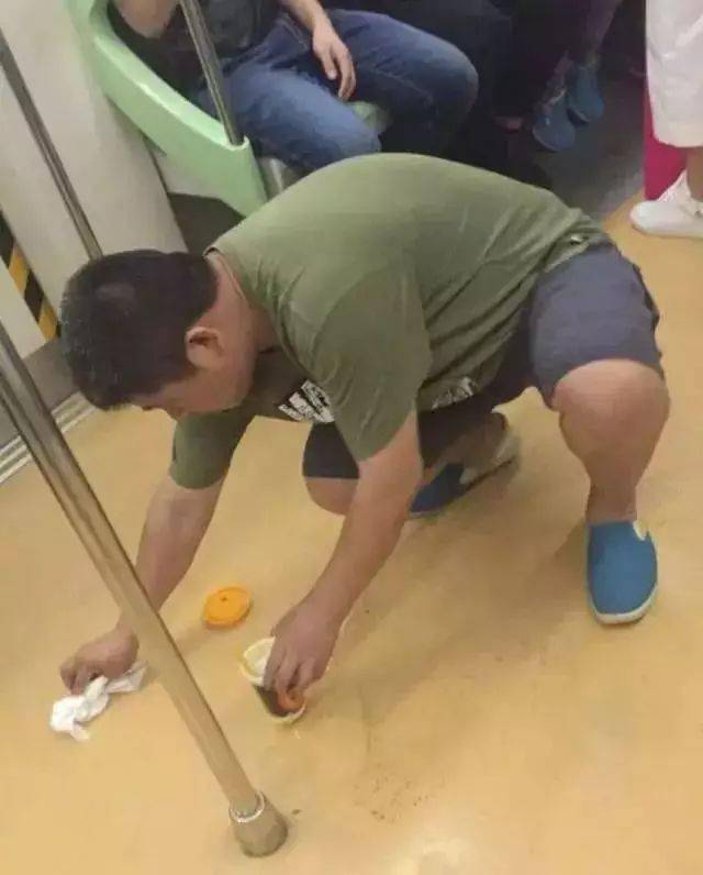 北京的一趟地鐵上,一個孩子因為身體不適在車廂內嘔吐。孩子的父親并沒有因此責怪他,而是立馬起身,向周圍的乘客道歉,然后蹲下身,拿紙巾把地上嘔吐物清理干凈。