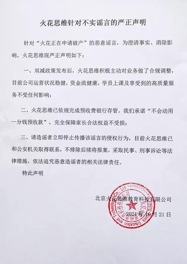 10月21日,火花思維針對“申請破產”傳聞發布澄清聲明。在聲明中,火花思維方面表示,“雙減”政策發布后,公司對業務做了合規調整,目前公司運營狀況穩健,資金流健康。