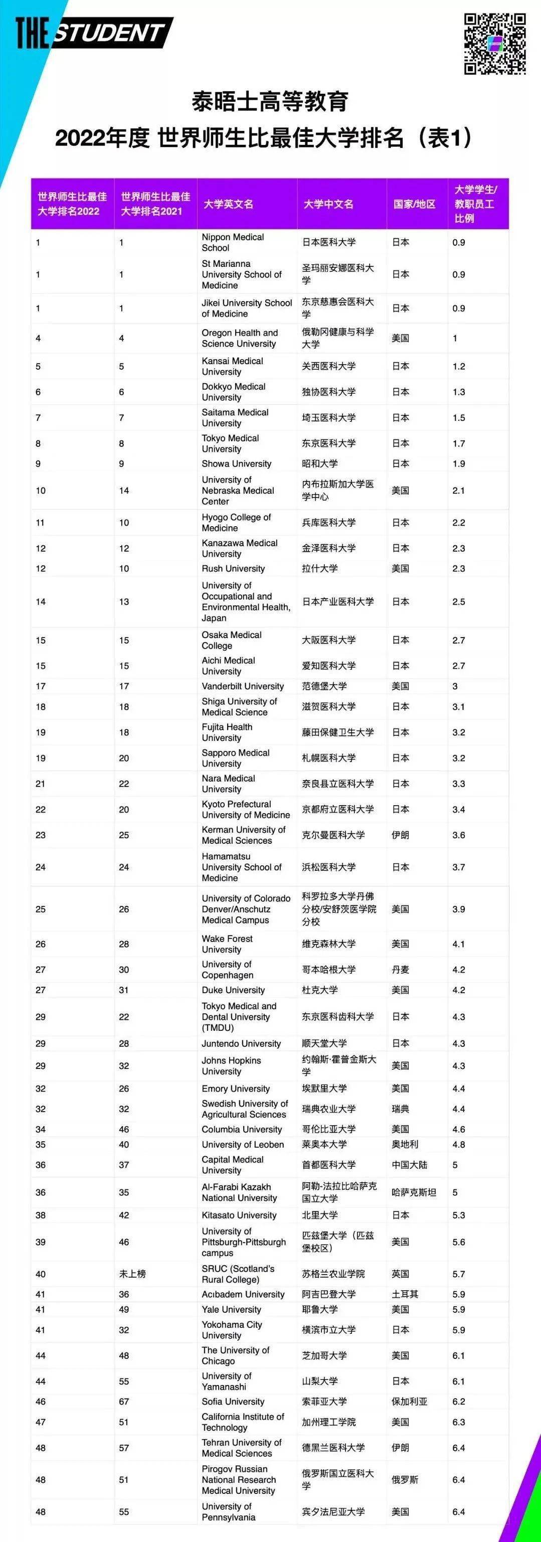 日本的大學(xué)在該榜單中占據(jù)了主導(dǎo)地位,共有36所大學(xué)上榜。其中有4所醫(yī)科大學(xué)位列前五,更有3所醫(yī)科大學(xué)以0.9的學(xué)生/教職員工比例并列第一名。