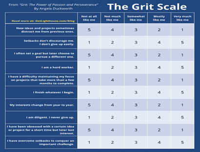 Duckworth教授在她2016年的暢銷書《Grit: The Power of Passion and Perseverance》中指出,GRIT是持久追求興趣和堅持不懈的結合體,GRIT所主張的堅持不懈不是外在壓力導致的被動的行為,是跟內驅力相關的性格特征,是一個人幾年內甚至幾十年內堅定不移地堅持追求自己的單一目標的能力,而且還會將這種加堅持不懈的能力轉移到別的事情上,從而更加容易獲得成功。