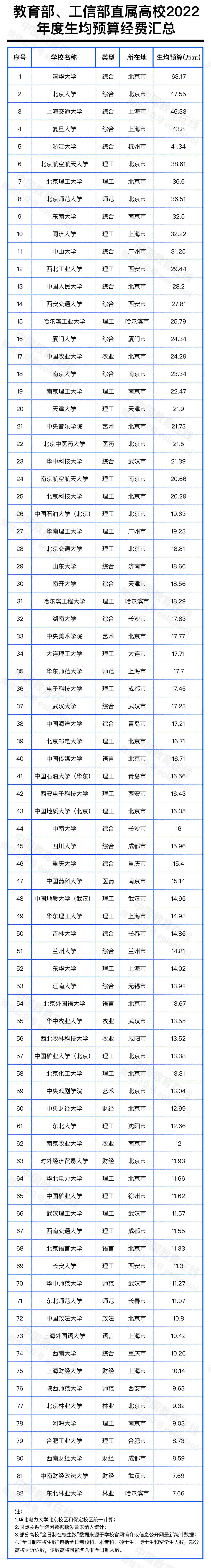教育部、工信部直屬高校2022年度生均預算經費匯總如下: