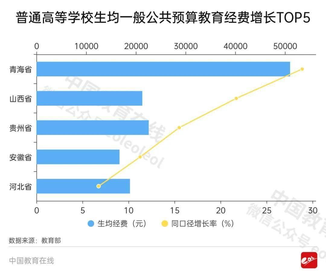 普通高校階段,大學生生均經費為22586.42元,同口徑比上年增長1.65%。 增長最快的是青海省(28.88%)。其次為山西省(21.72%)、貴州省(15.52%)、安徽省(11.27%)、河北省(6.76%)。
