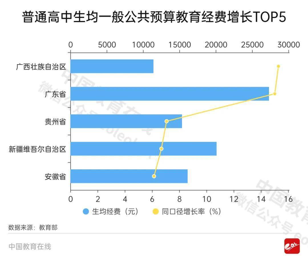全國普通高中為18808.71元,同口徑比上年增長2.95%。各省區(qū)市中, 增長最快的是廣西壯族自治區(qū)(15.29%)。其次為廣東省(15.02%)、貴州省(7.07%)、新疆維吾爾自治區(qū)(6.69%)、安徽省(6.15%)。