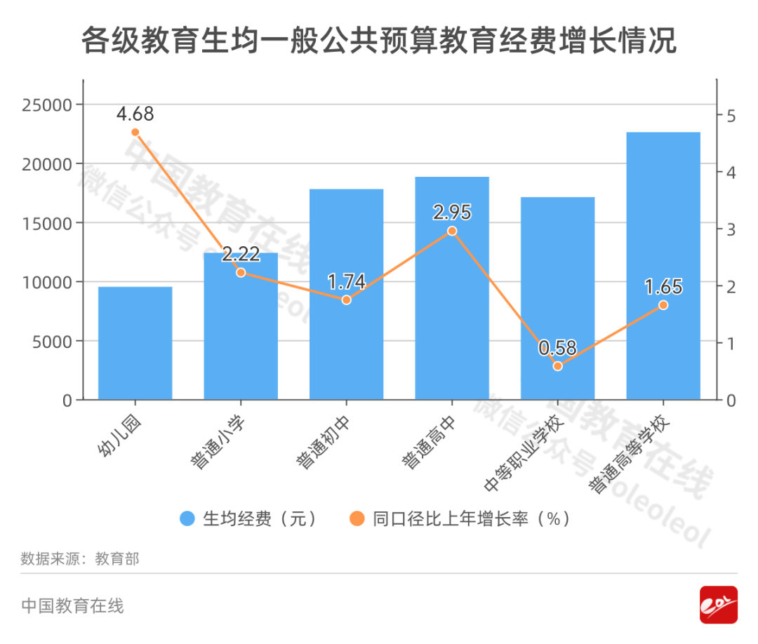 其中,增長最快的是幼兒園,比上一年增長4.68%,達到了9505.84元。普通小學為12380.73,同比增長2.22%,普通初中為17772.06,同比增長1.74%,普通高中18808.71,同比增長2.95%,中職與普通高校增長最低,分別為17095.26與22586.42,僅增長0.58%和1.65%。