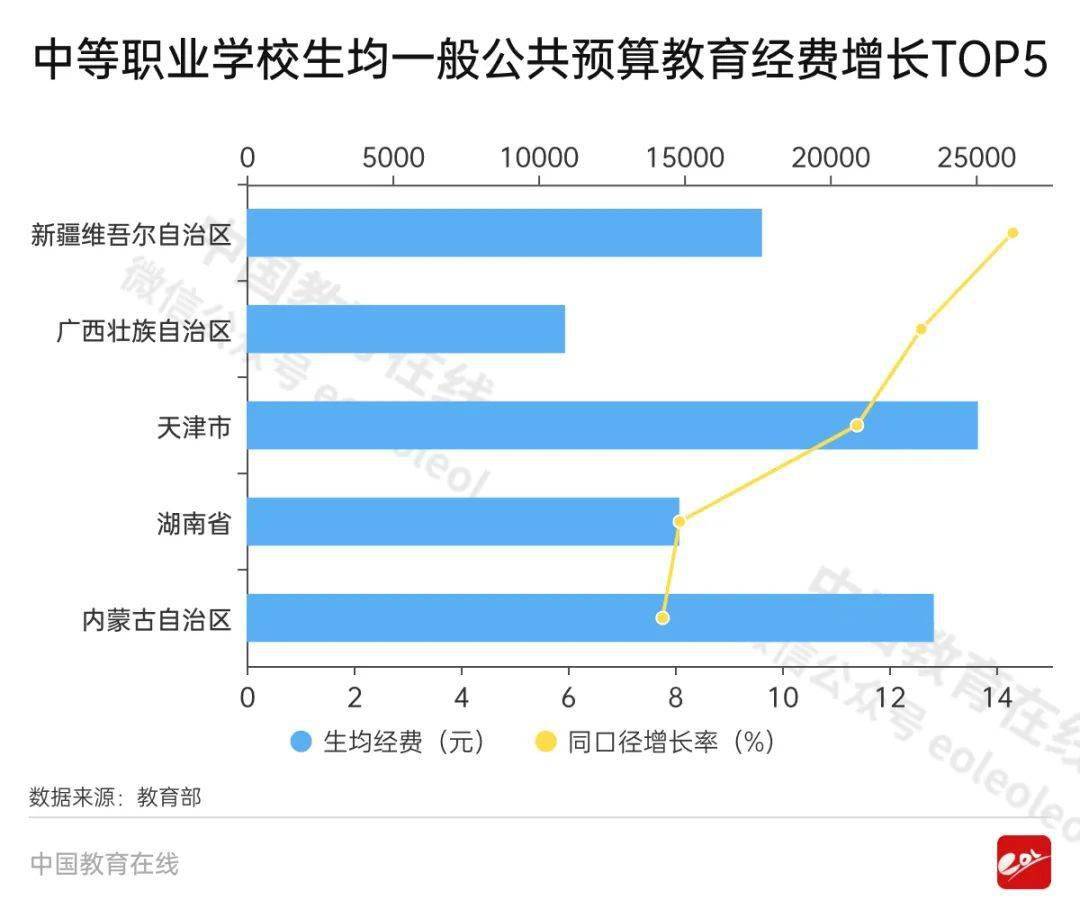 全國中等職業(yè)學校為17095.26元,同口徑比上年增長0.58%。各省區(qū)市中, 增長最快的是新疆維吾爾自治區(qū)(14.31%)。其次為廣西壯族自治區(qū)(12.6%)、天津市(11.4%)、湖南省(8.09%)、內蒙古自治區(qū)(7.77%)。