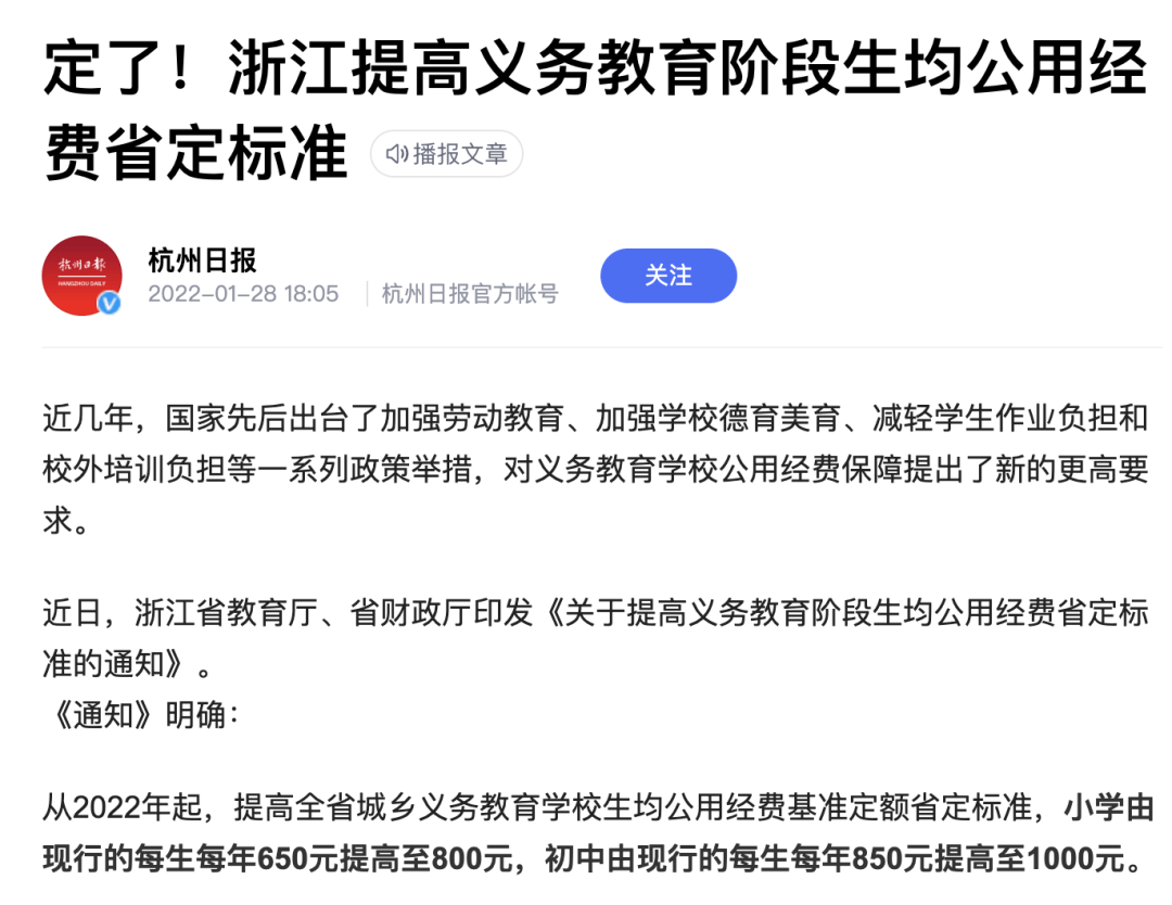 近期,浙江省、青島市等相繼發(fā)布提高義務教育學校生均公用經費標準的通知,浙江從2022年起,小學由現行的每生每年650元提高至800元,初中由現行的每生每年850元提高至1000元。青島明確從2022年12月起,分別由小學每生每年900元、初中每生每年1100元,統(tǒng)一提高至小學每生每年1300元、初中每生每年1700元。