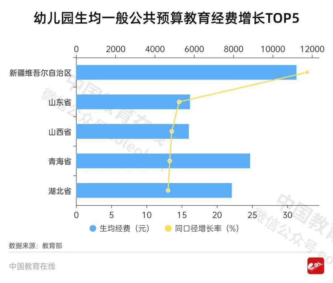 全國幼兒園為9505.84元,同口徑比上年增長4.68%。各省區(qū)市中, 增長最快的是新疆維吾爾自治區(qū)(32.81%)。其次為山東省(14.64%)、山西省(13.59%)、青海省(13.31%)、湖北省(13.07%)。
