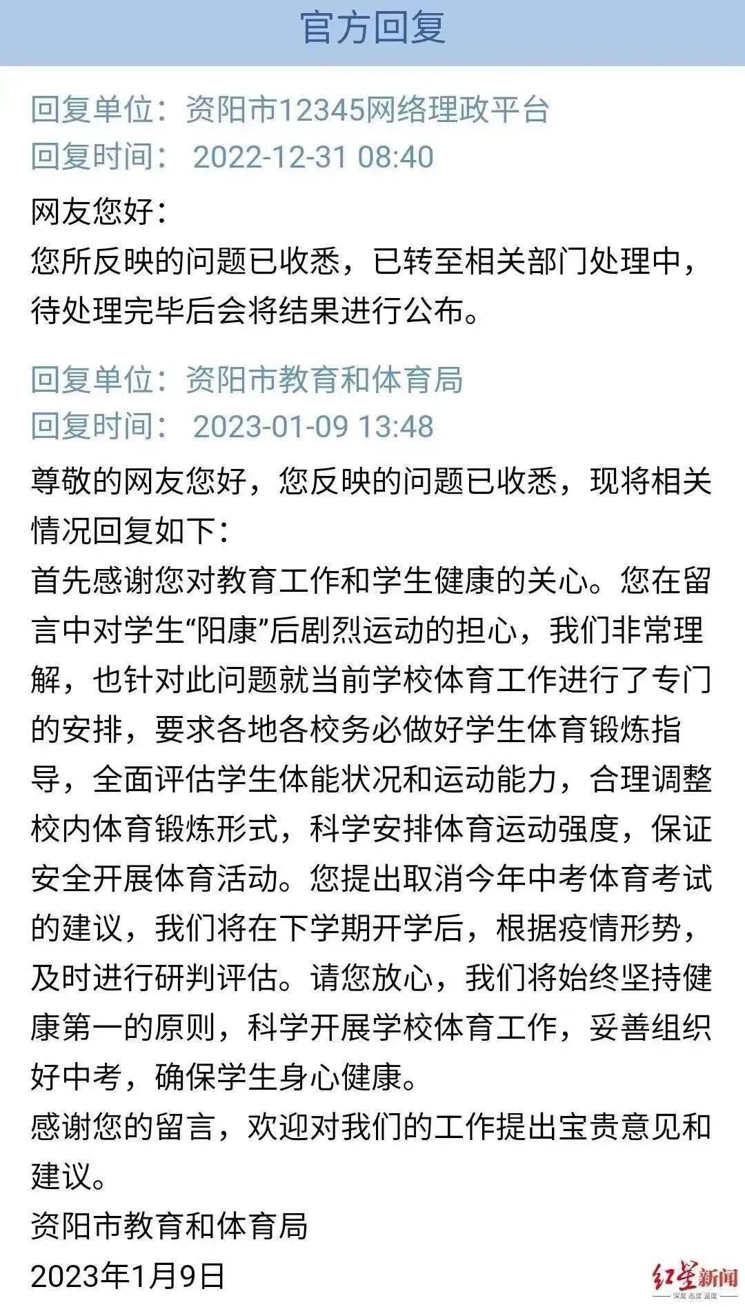 資陽市教育和體育局還表示,關于網友提出取消今年中考體育考試的建議,教體部門將在下學期開學后,根據疫情形勢,及時進行研判評估。