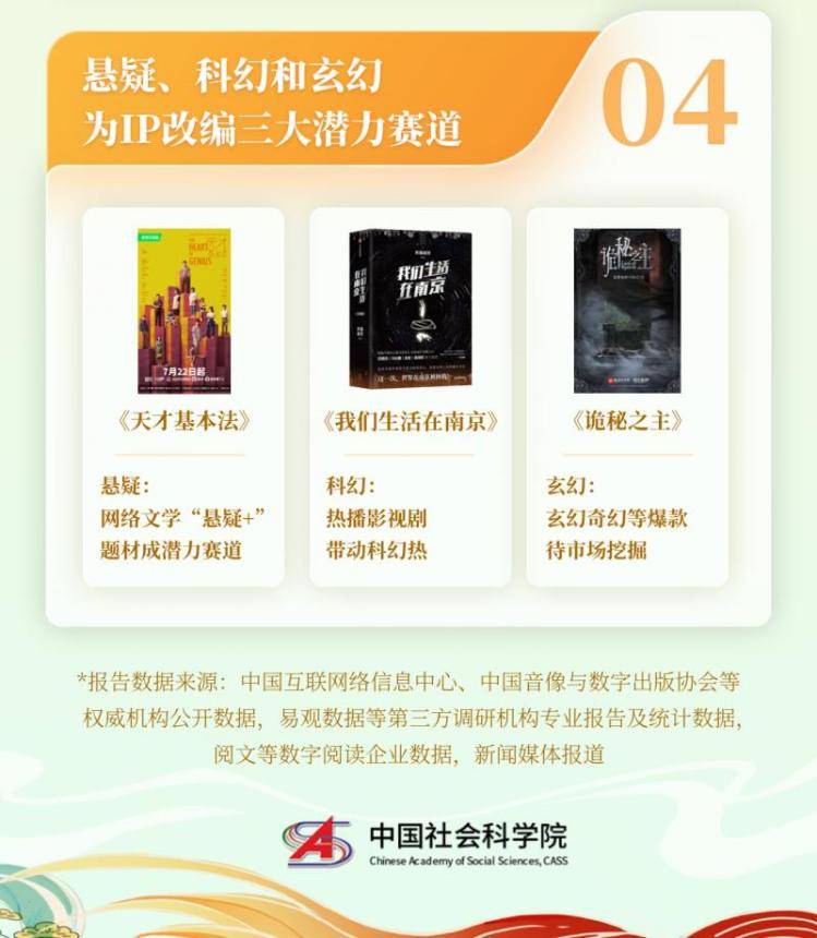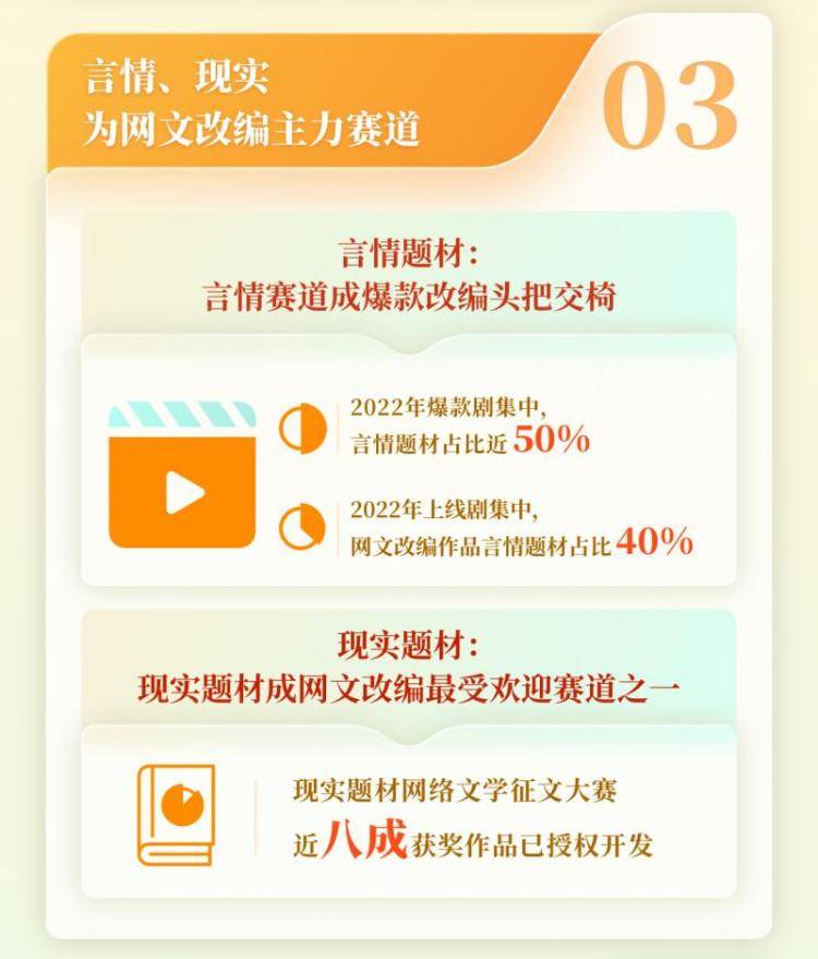 報告認為,IP生態鏈工業能力在近幾年實現了顯著提升,網文IP的轉化周期呈現出上線周期縮短、生命周期延長的特點,如《星辰變》《全職高手》《贅婿》等生命周期超過10年的IP,至今仍然能通過持續開發維系熱度。報告指出,言情、現實已經成為IP改編主力賽道,2022年上線劇集中,網文改編作品言情題材占比40%;同時,報告也認為,懸疑、科幻、玄幻是IP改編的三大潛力賽道,為下游市場提供了豐富的挖掘素材,以及可觀的增量市場空間。