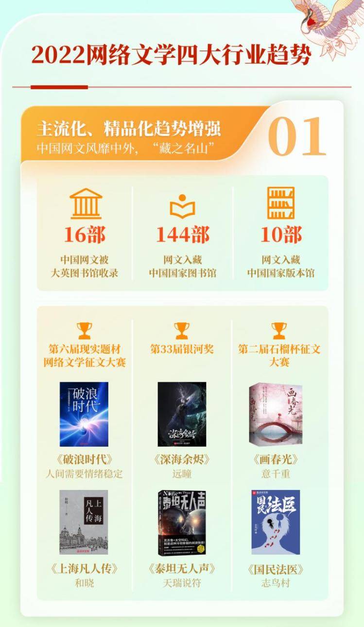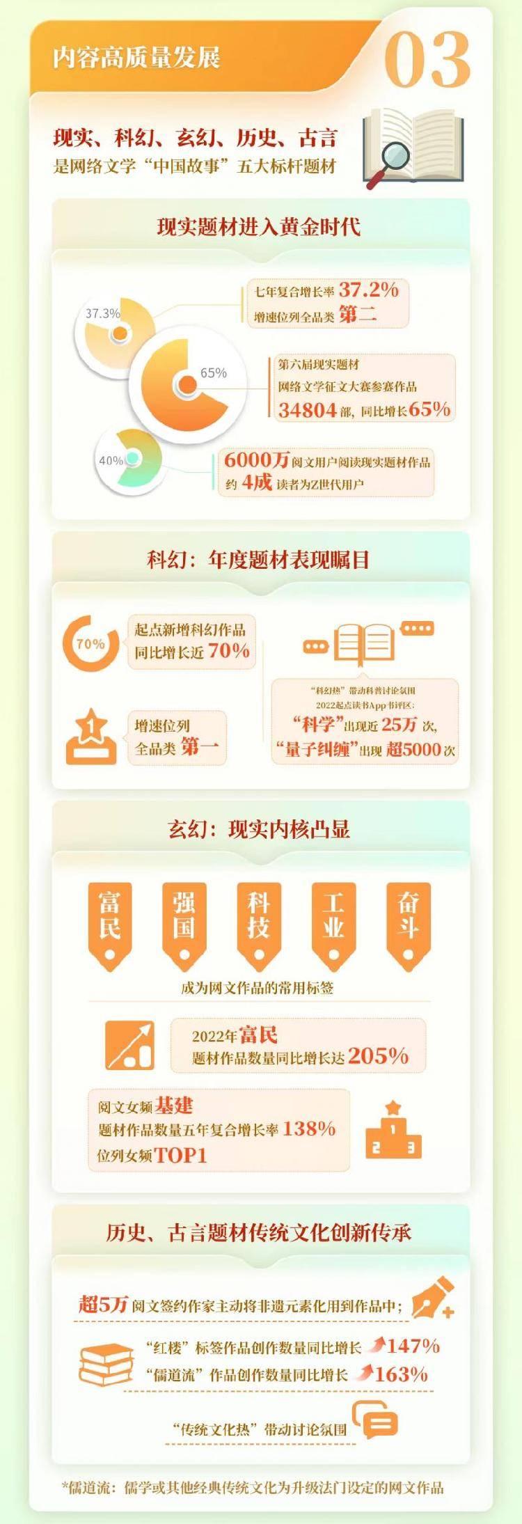 內容題材層面,隨著網絡文學“題材轉向”,現實、科幻、玄幻、歷史、古言成為“中國故事”五大標桿題材:現實題材作品以37.2%的高復合增長率,邁入“黃金時代”;玄幻題材照出強國奮斗的“現實品格”,富民、強國、科技、工業、奮斗成為網文作品的常用標簽,2022年閱文“富民”題材作品數量同比增超200%,與“強國”并列為閱文TOP20創作標簽;超5萬閱文作家在歷史、古言等題材網文中運用非遺元素,傳統文化深入內容題材,引發了“儒道流”“紅樓”等國風熱潮,閱文“紅樓”標簽下作品2022年創作數量同比增長147%。