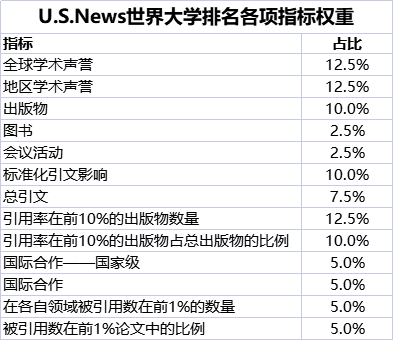 U.S. News發(fā)布的2023年世界大學排名中,學術(shù)相關(guān)指標范圍涵蓋了學術(shù)聲譽、論文引用。其中,學術(shù)聲譽又詳細分為了世界學術(shù)聲譽以及區(qū)域?qū)W術(shù)聲譽,各占比12.5%。論文引用則使用了論文引用指數(shù)以及分學科領(lǐng)域、不同層次的論文引用數(shù)量、論文引用率等6項指標,權(quán)重占比達50%。