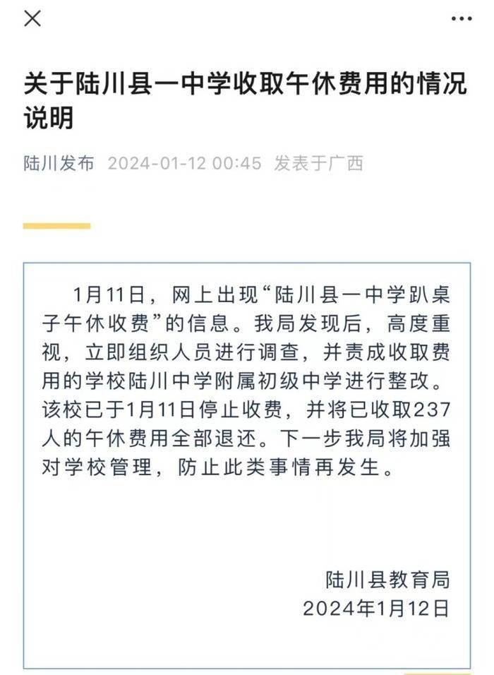 面對(duì)洶洶輿情,陸川縣教育局立即組織人員進(jìn)行調(diào)查,并發(fā)布了相關(guān)情況說明,表示已責(zé)成收取費(fèi)用的陸川中學(xué)附屬初級(jí)中學(xué)進(jìn)行整改。目前,該校已停止收費(fèi),并將已收取237人的午休費(fèi)用全部退還。下一步將加強(qiáng)對(duì)學(xué)校管理,防止此類事情再發(fā)生。