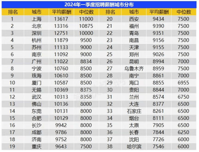 從智聯招聘2024年第一季度各城市的平均月薪來看,上海、北京和深圳薪資位列三甲,最高的上海平均薪資是13617。