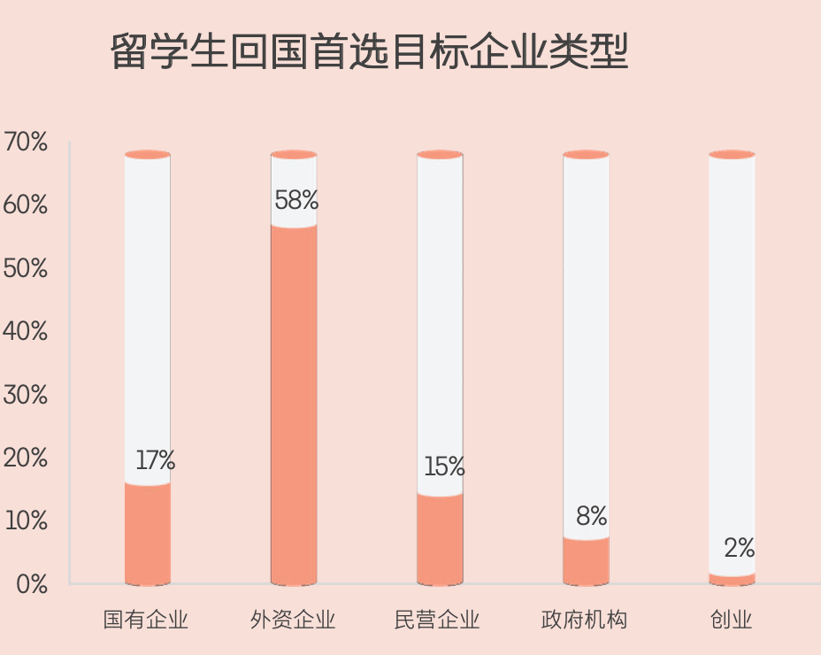在歸國就業的首選目標企業類型方面,外資企業(58%)仍是海歸留學生的首選,原因可能是其國際化工作環境和高薪酬。