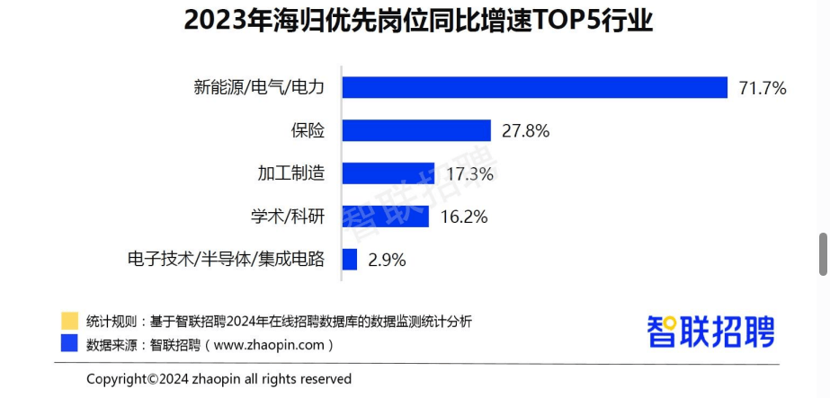 其中,新能源、電氣和電力行業尤為突出,其對海歸人才的崗位投放量較2022年激增了高達71.1%。