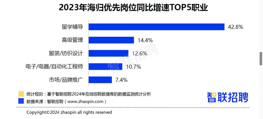 從具體崗位角度看,2023年海歸優先崗位的增長勢頭強勁,留學輔導崗位的同比增速尤為突出,達到了42.8%。