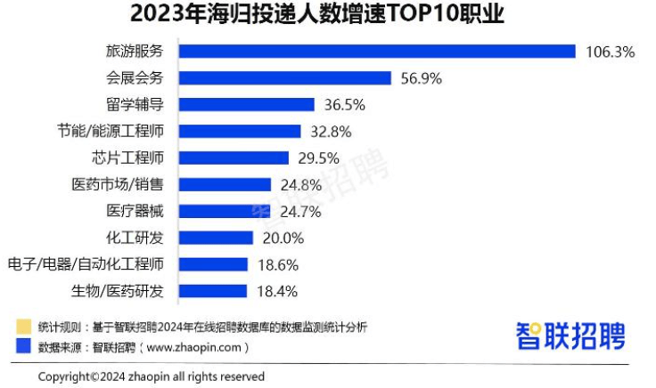 從職業看,2023年海歸投遞人數增速最快的三大職業為旅游服務、會展會務、留學輔導,增速分別為106.3%、56.9%、36.5%。