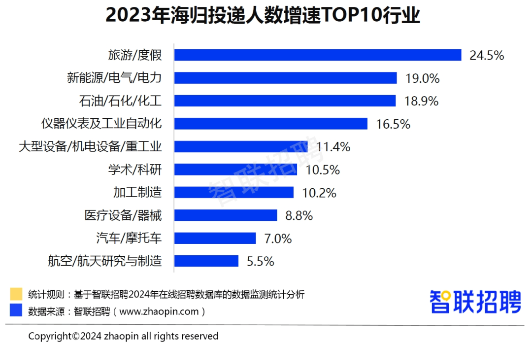 2023年海歸投遞人數增速最快的十大行業中,旅游/度假行業位居榜首,增速達到24.5%,主要涉及旅游規劃、旅游產品經理等崗位。