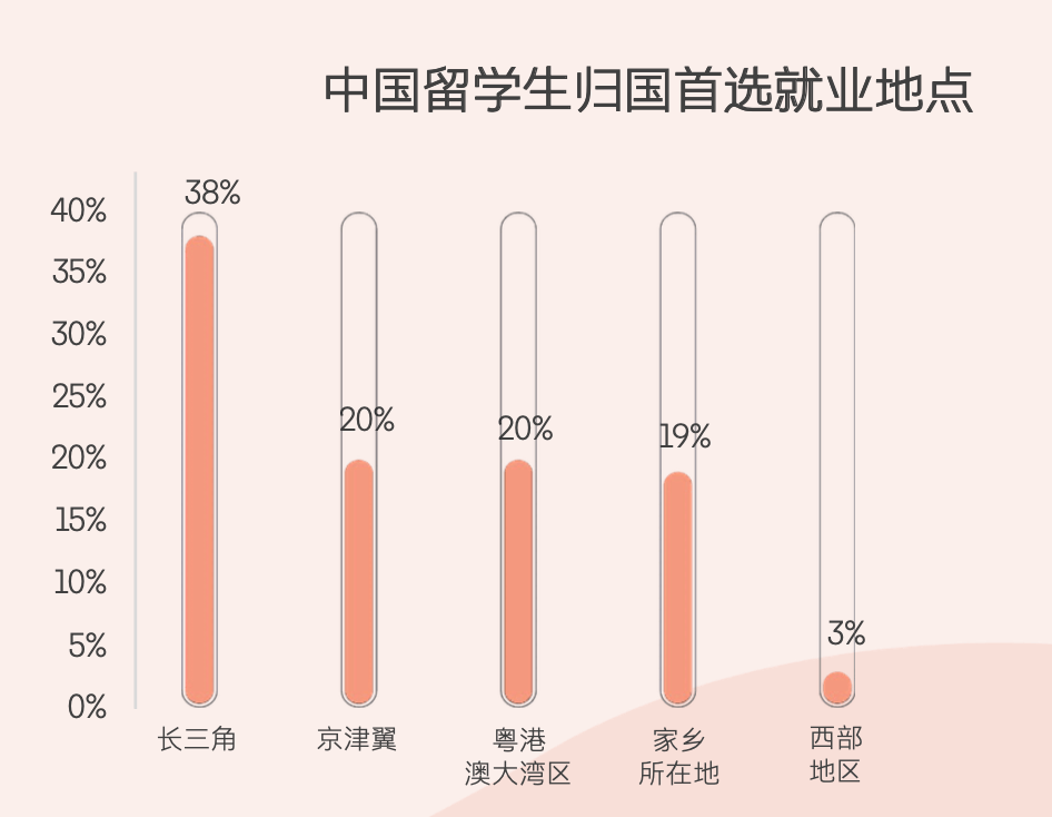 8%的中國留學生首選長三角地區就業,其次是京津冀和粵港澳大灣區,各占20%。