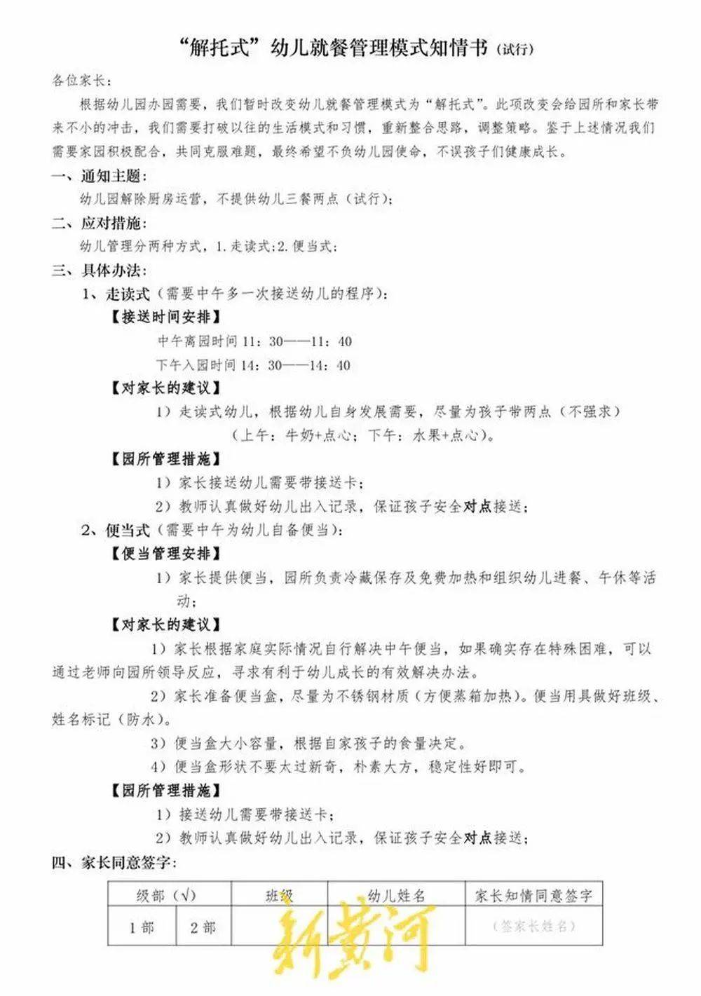 在上述幼兒家長(zhǎng)提供的一份《“解托式”幼兒就餐管理模式知情書(試行)》上提及,幼兒園解除廚房運(yùn)營(yíng),不提供幼兒三餐兩點(diǎn);幼兒管理分為“走讀式”和“便當(dāng)式”。“走讀式”需要家長(zhǎng)中午多一次接送幼兒的程序,“便當(dāng)式”需要家長(zhǎng)提供便當(dāng),園方負(fù)責(zé)冷藏保存及免費(fèi)加熱和組織幼兒進(jìn)餐、午休等。