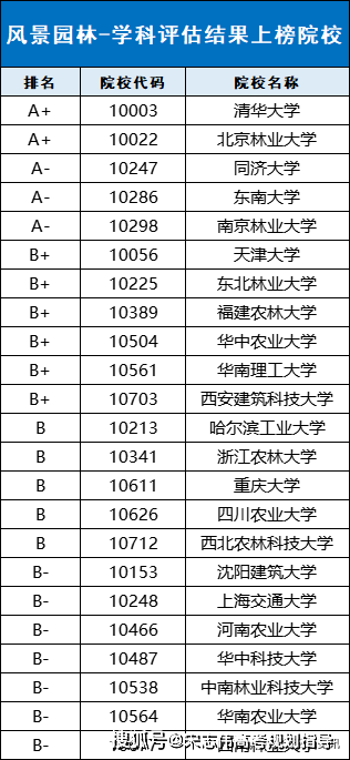 全國共有39所院校風(fēng)景園林專業(yè)上榜,北京林業(yè)大學(xué)的風(fēng)景園林專業(yè)與清華大學(xué)并列為A+,超過了同濟(jì)大學(xué)、東南大學(xué)、天津大學(xué)等985高校。