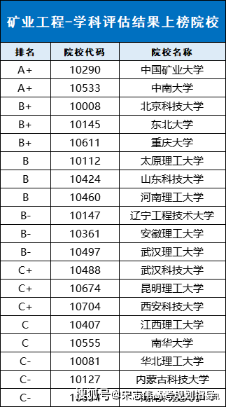 下表為礦業(yè)工程學(xué)科具體評(píng)級(jí)信息: