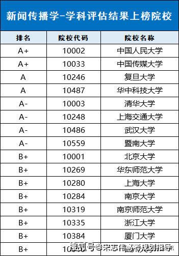 下表為新聞傳播學(xué)學(xué)科具體評(píng)級(jí)信息: