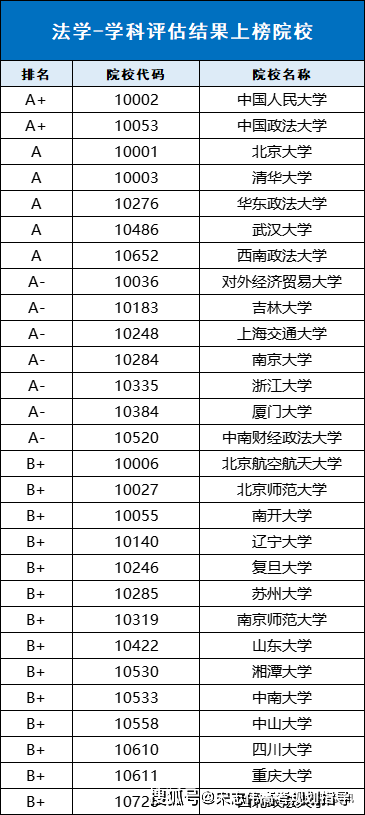 下表為法學(xué)學(xué)科具體評(píng)級(jí)信息: