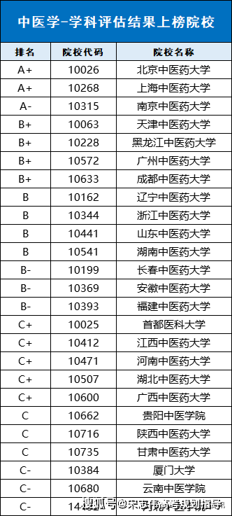下表為中醫(yī)學(xué)學(xué)科具體評(píng)級(jí)信息: