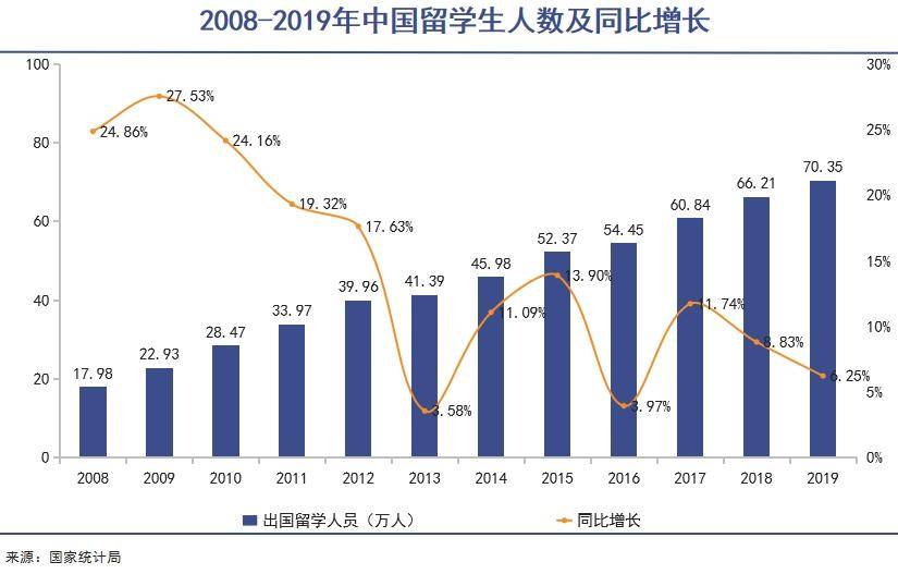 另據國家統計局的數字,到了2019年,一年留學人數超過70萬,較2011年再翻倍。