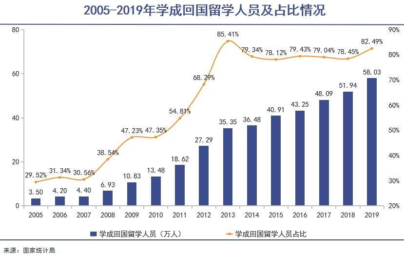 過去的近20年的時間里,出國留學然后再回國工作的學生越來越多。已經從2005年的不足三成,增至后來的80%以上。