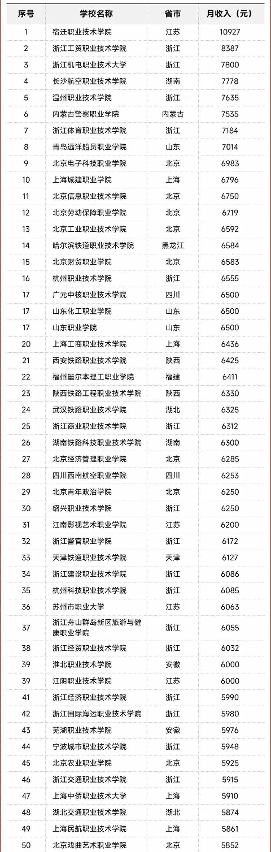 全國(guó)高職院校2023屆畢業(yè)生月收入TOP50