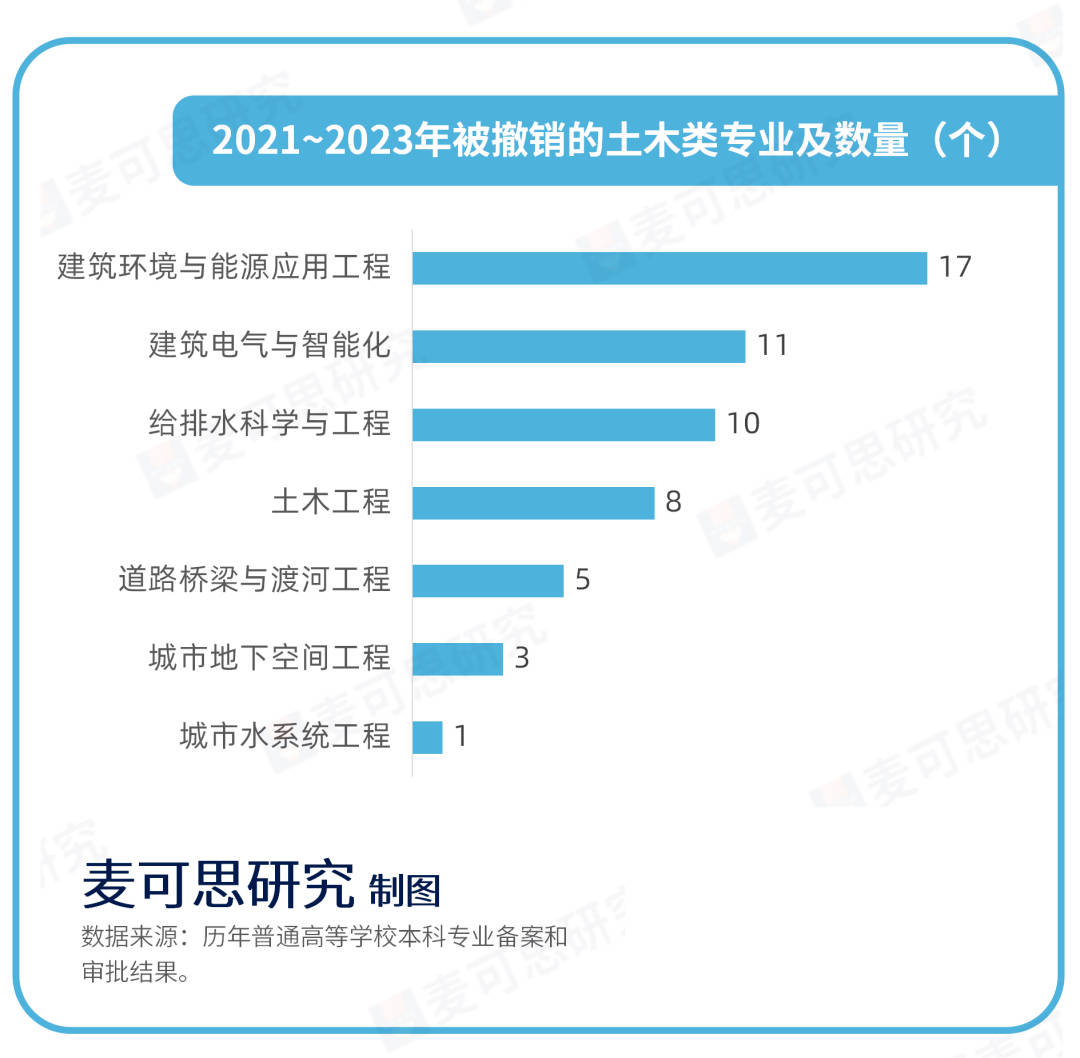 另據教育部普通高校本科專業撤銷情況的數據統計,近三年,土木類本科專業撤銷數量出現明顯增長,繼2021年、2022年撤銷數量持續超過10個(分別為14個、11個),2023年其撤銷數量躍升至30個。從具體專業看,三年中被撤銷較多的有建筑環境與能源應用工程(17個)、建筑電氣與智能化(11個)、給排水科學與工程(10個)、土木工程(8個)。