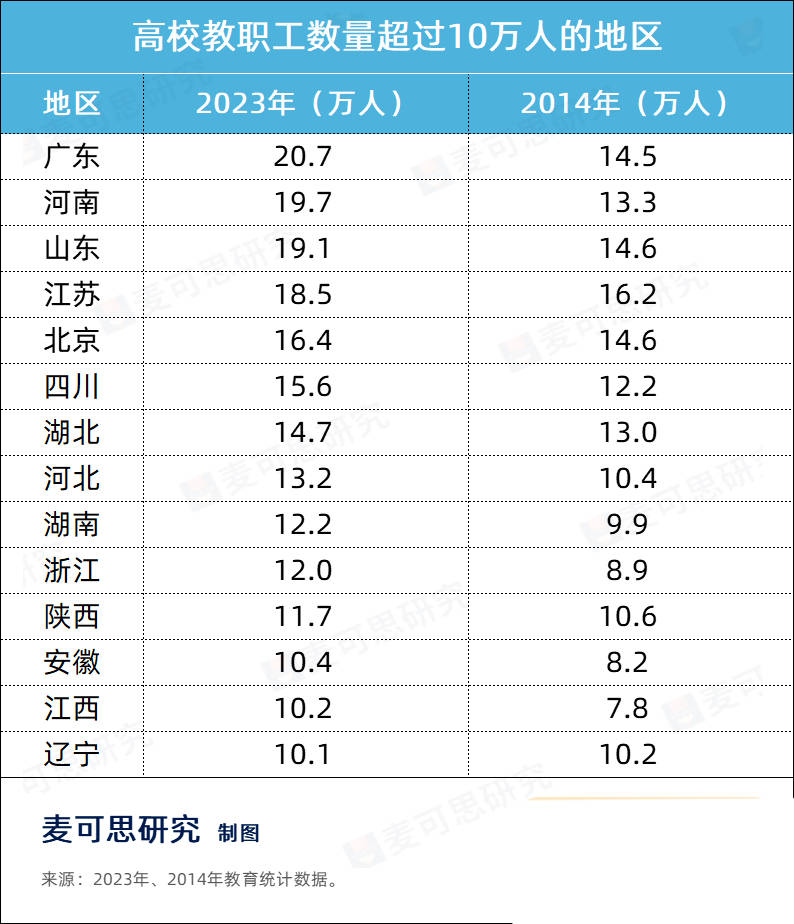 ?廣東高校教職工數(shù)量突破20萬,領(lǐng)跑全國;河南高校10年猛增6.4萬教職工。
