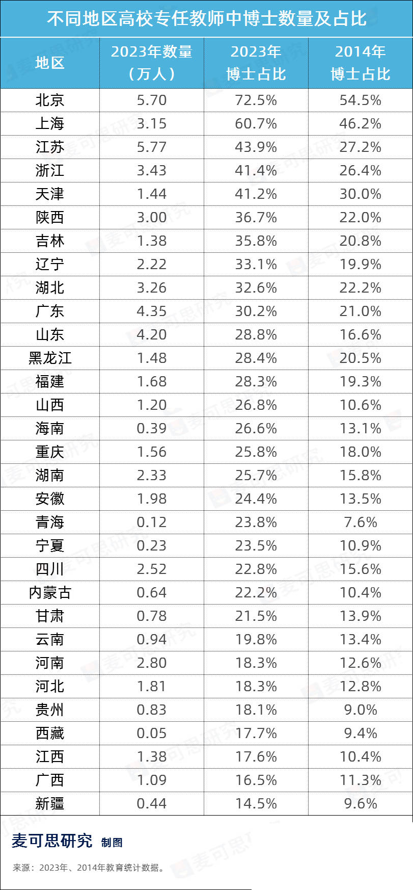 ?2023年高校專任教師中,擁有博士學(xué)位教師62.2萬人,較2014年數(shù)量接近翻倍;北京高校專任教師中,超7成是博士。