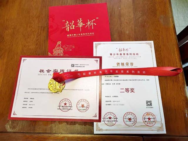 2025年1月25日,《中國新聞周刊》記者收到兩份證書和一塊獎(jiǎng)牌,分別為“韶華杯”省級(jí)榮譽(yù)二等獎(jiǎng)、社會(huì)實(shí)踐證書和一枚獎(jiǎng)牌。在“省級(jí)榮譽(yù)二等獎(jiǎng)”的證書上,寫有記者報(bào)名時(shí)填寫的學(xué)生姓名和作品名稱,并寫著“經(jīng)韶華杯組委會(huì)專家評(píng)審委員會(huì)綜合評(píng)定,榮獲省級(jí)書法活動(dòng)初中組二等獎(jiǎng)”。