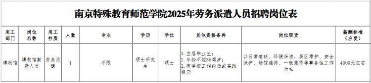近日,有網友發帖稱,南京特殊教育師范學院2025年公開招聘勞務派遣工作人員,招錄的博物館勤雜人員一職,要求不得超過35周歲、應屆畢業生、碩士學歷,月薪4000元左右。該崗位主要負責日常值班、環境保潔、安全保護等。