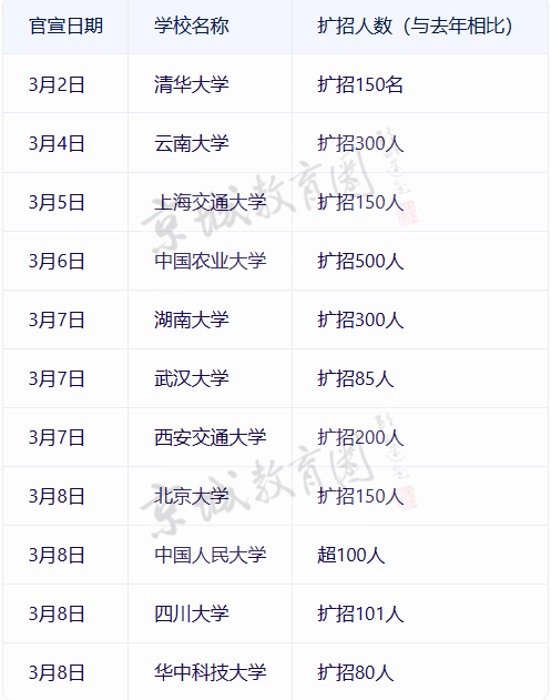 近日,清華大學官宣擴招,拉開了北京高校2025年擴招的序幕。一石激起千層浪。繼清華大學之后,北京大學、中國人民大學、上海交通大學、武漢大學等等陸續對外公布了擴招消息,預示2025年高校擴招已成定局,高考“擴招潮”正式開啟!