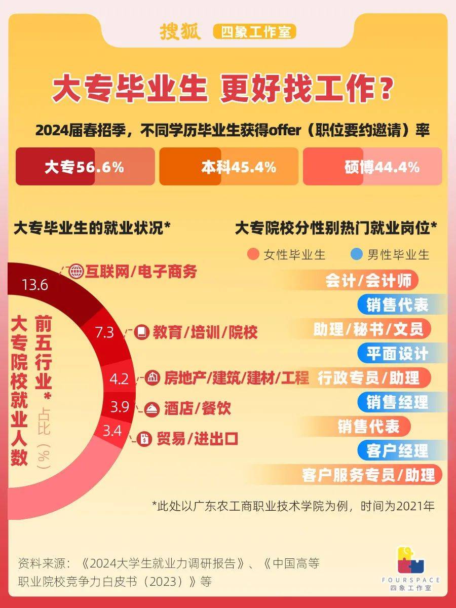 以廣東農工商職業技術學院為例,2021年該校畢業生的就業集中在電子商務、教育培訓等行業 ,最熱門的就業崗位就包括了銷售代表、客服專員等等。