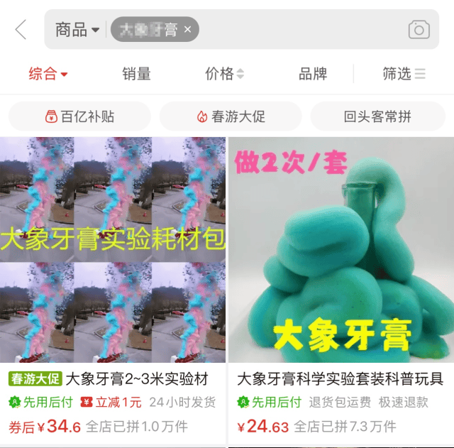 記者發現,“**之蛇”和“**牙膏”等危險網紅實驗所需的材料,都能在電商平臺輕易買到。而商家售賣的實驗套裝不但材質低廉,所含內容物成分也標注得十分模糊,缺乏必要的安全風險警示,有不小的安全隱患。