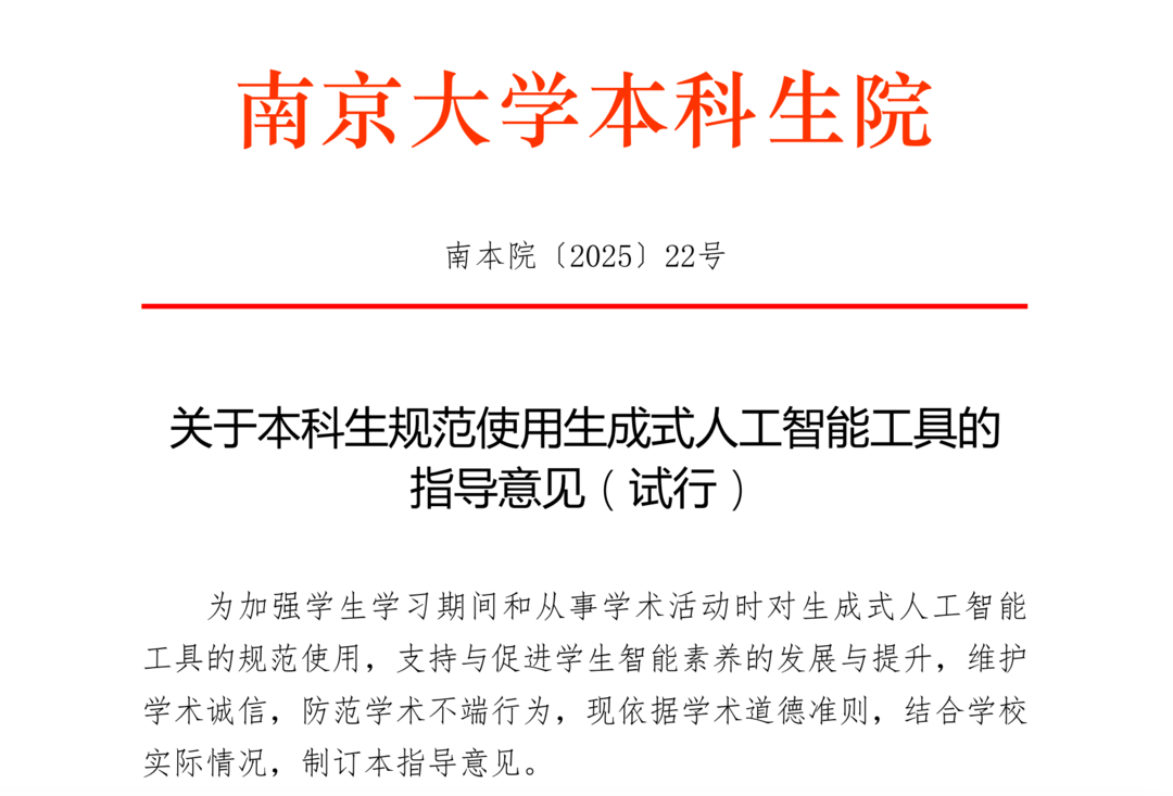 南京大學本科生院院長王駿向記者提供了《關于本科生規(guī)范使用生成式人工智能工具的指導意見(試行)》全文。禁止“關鍵內容的創(chuàng)作替代”是文件中作為醒目的一條: