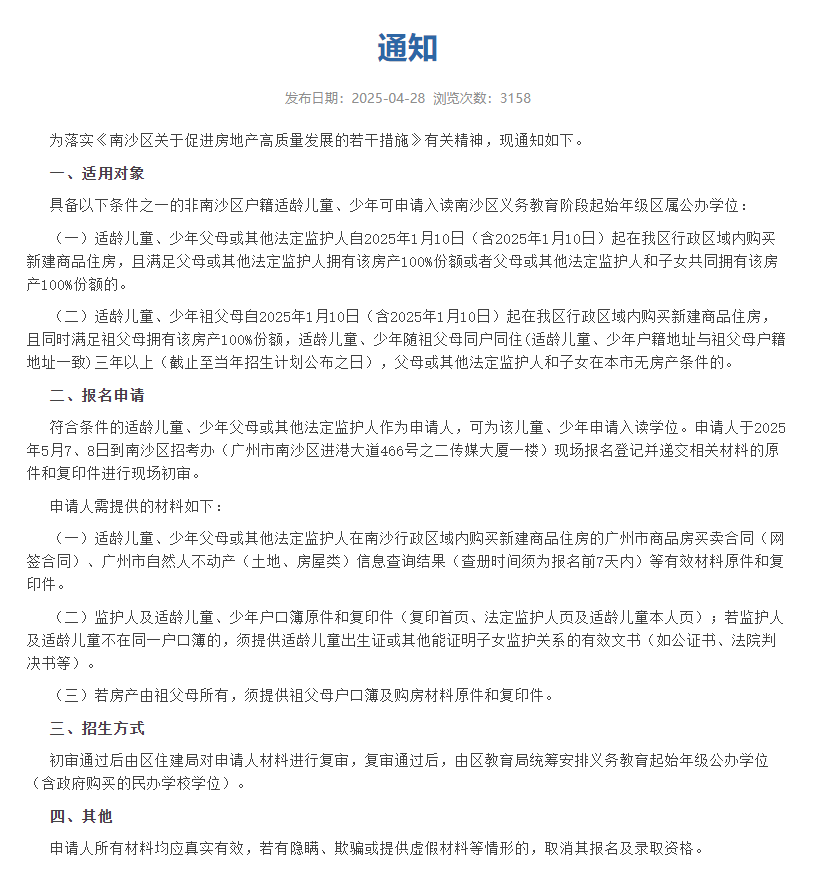 4月28日,廣州南沙區教育局發布通知稱,符合條件的非南沙區戶籍適齡兒童、少年可申請入讀南沙區義務教育階段起始年級區屬公辦學位。