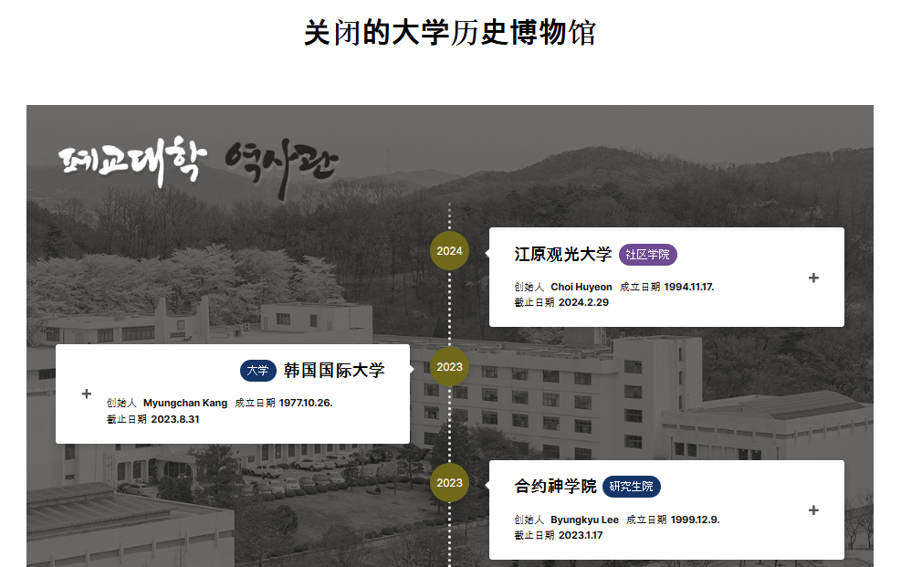 “倒閉大學(xué)綜合管理系統(tǒng)”匯總了韓國(guó)已倒閉大學(xué)的情況,并建有一座線上的倒閉大學(xué)“歷史博物館”