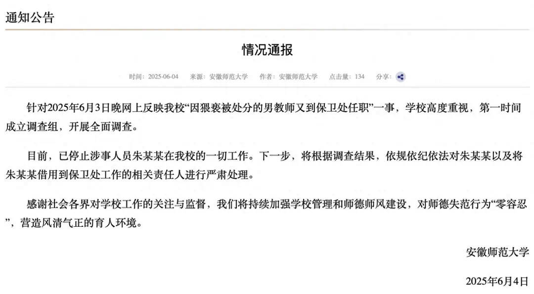 徽師范大學(xué)通報(bào)“因猥褻被處分的男教師又到保衛(wèi)處任職”:停止涉事人員一切