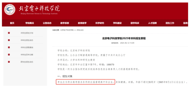 北京電子科技學院2025年本科招生章程指出,招生對象明確指出:考生應為符合高考報名條件的應屆普通高中畢業生,身體健康,未婚,年齡不超過20周歲(2005年9月1日以后出生)。