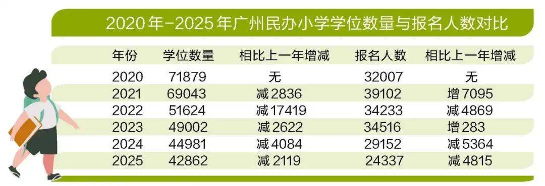 日前,廣州11區民辦小學電腦搖號派位結束。17日,《雋言教育》從廣州市教育局獲悉,全市245所民辦小學提供42862個學位,報名兒童24337人。相比2024年,報名人數減少4815人,招生學校減少2所,學位數量減少2119個。學位數量和報名人數都創6年來最低。