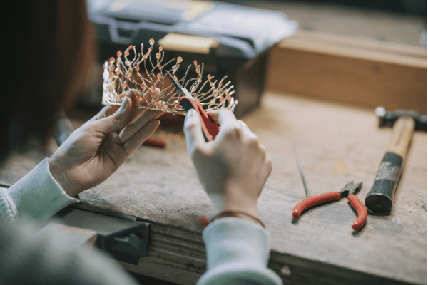 學生在大學工作臺用鉗子調整手工制作珠寶。