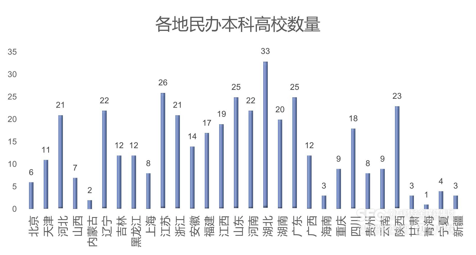 從分布來看,我國31個省份里除了西藏以外,每個省份都有民辦高校,分布相對均衡。湖北、江蘇、山東、廣東、陜西的數(shù)量靠前,分別有33、26、25、25、23所。