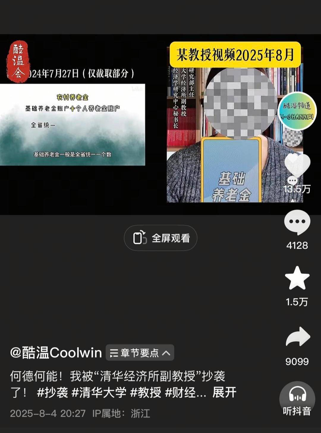 8月4日,抖音博主“酷溫Coolwin”發布視頻,稱清華大學一副教授發布的抖音視頻疑似抄襲了自己的一則視頻。其提供了共約3分鐘的兩則視頻部分內容對比,認為“不能說一模一樣,只能說像素級的復制吧”。該博主提出,抄襲發生或與賬號背后的MCN公司有關,“教授應該不知道,但是應該要讓教授知道。”
