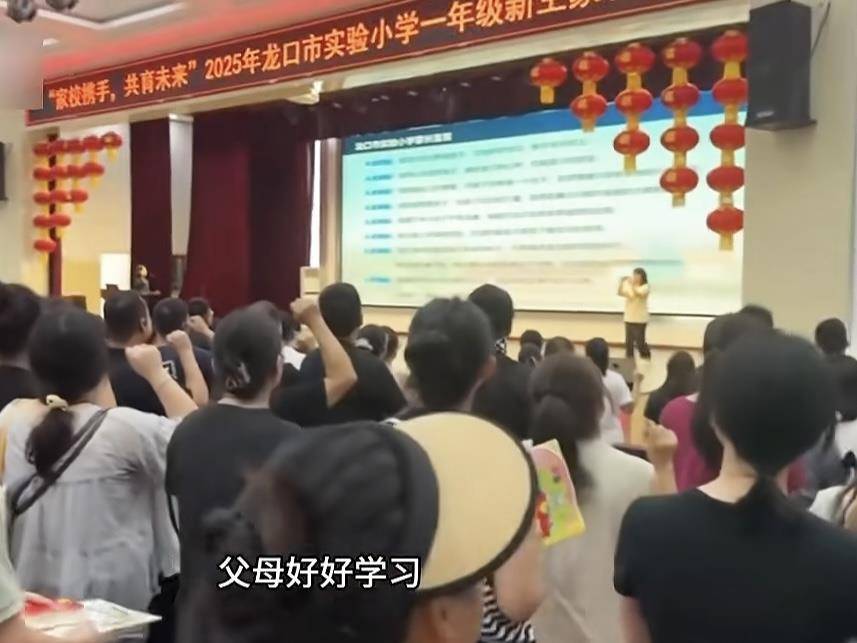 網友發布的視頻顯示,2025年山東龍口實驗小學禮堂內,不少家長在老師帶領下宣誓道:“用行動去影響孩子,父母好好學習,孩子天天向上。”